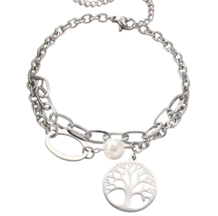 Expresa tu individualidad con esta pulsera de acero inoxidable de PM ELEGANCE**, que combina delicadeza y carácter. Su diseño de charm combina un delicado símbolo del árbol de la vida con una luminosa perla blanca, suspendida de una cadena de doble capa con un estilo decididamente moderno.