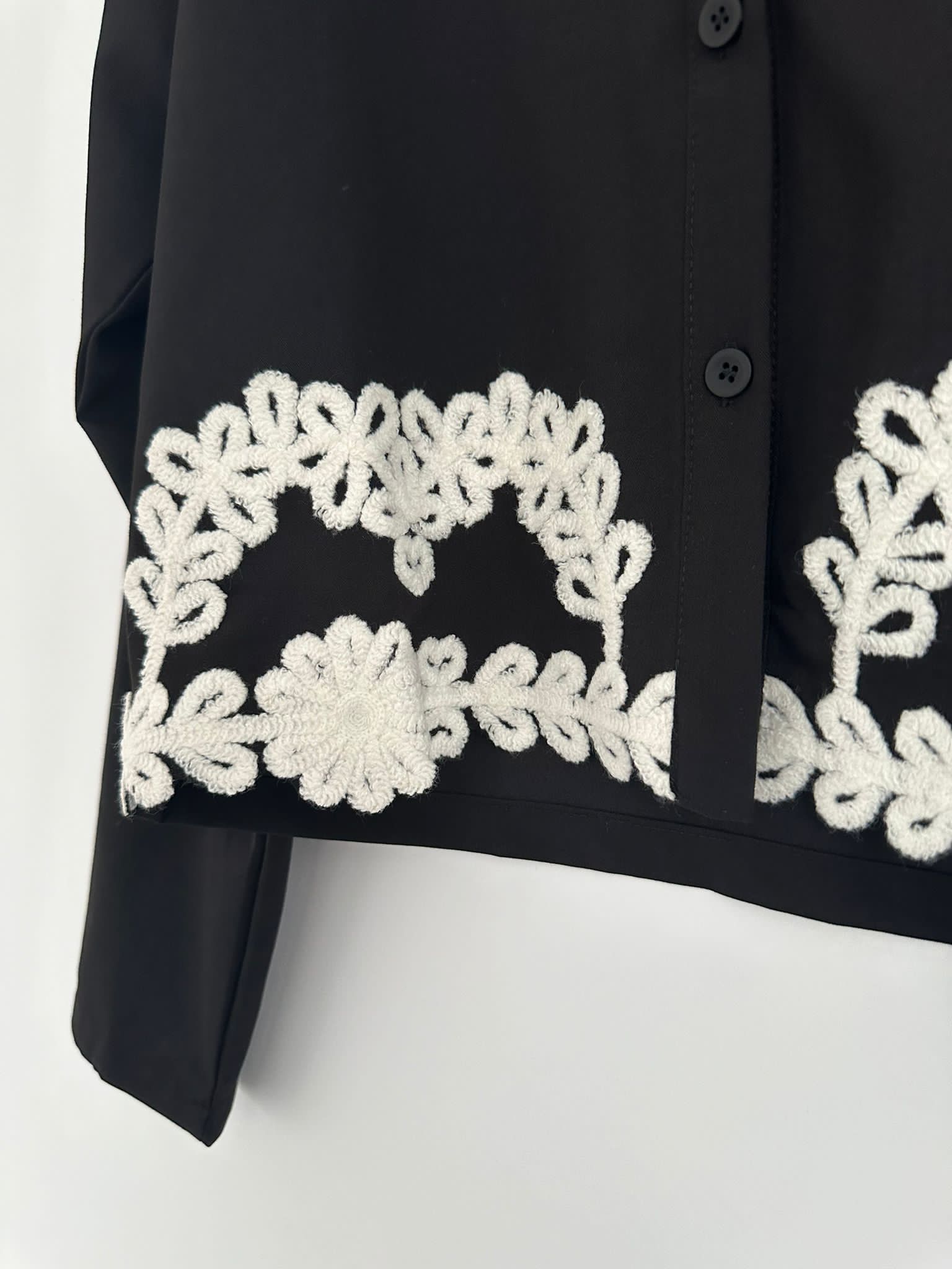 La camisa presenta diseños de palmeras bordados a mano en un blanco nítido, lo que agrega un toque sutil pero refinado al aspecto general. El pantalón negro a juego, también de corte recto, completa armoniosamente este look, con un acabado impecable que resalta la elegancia y sencillez del diseño.